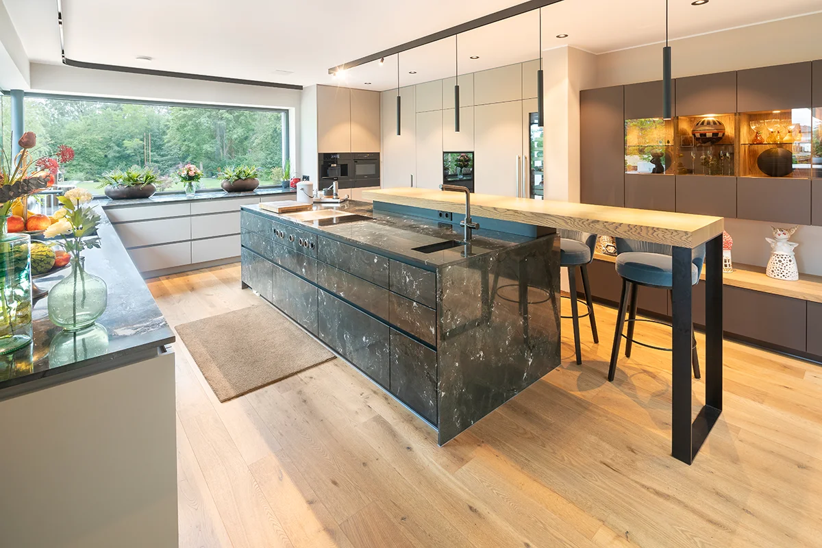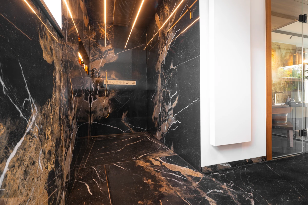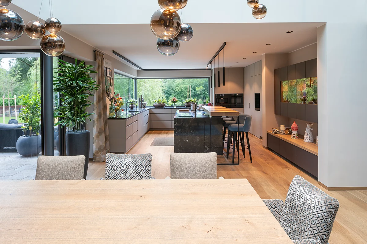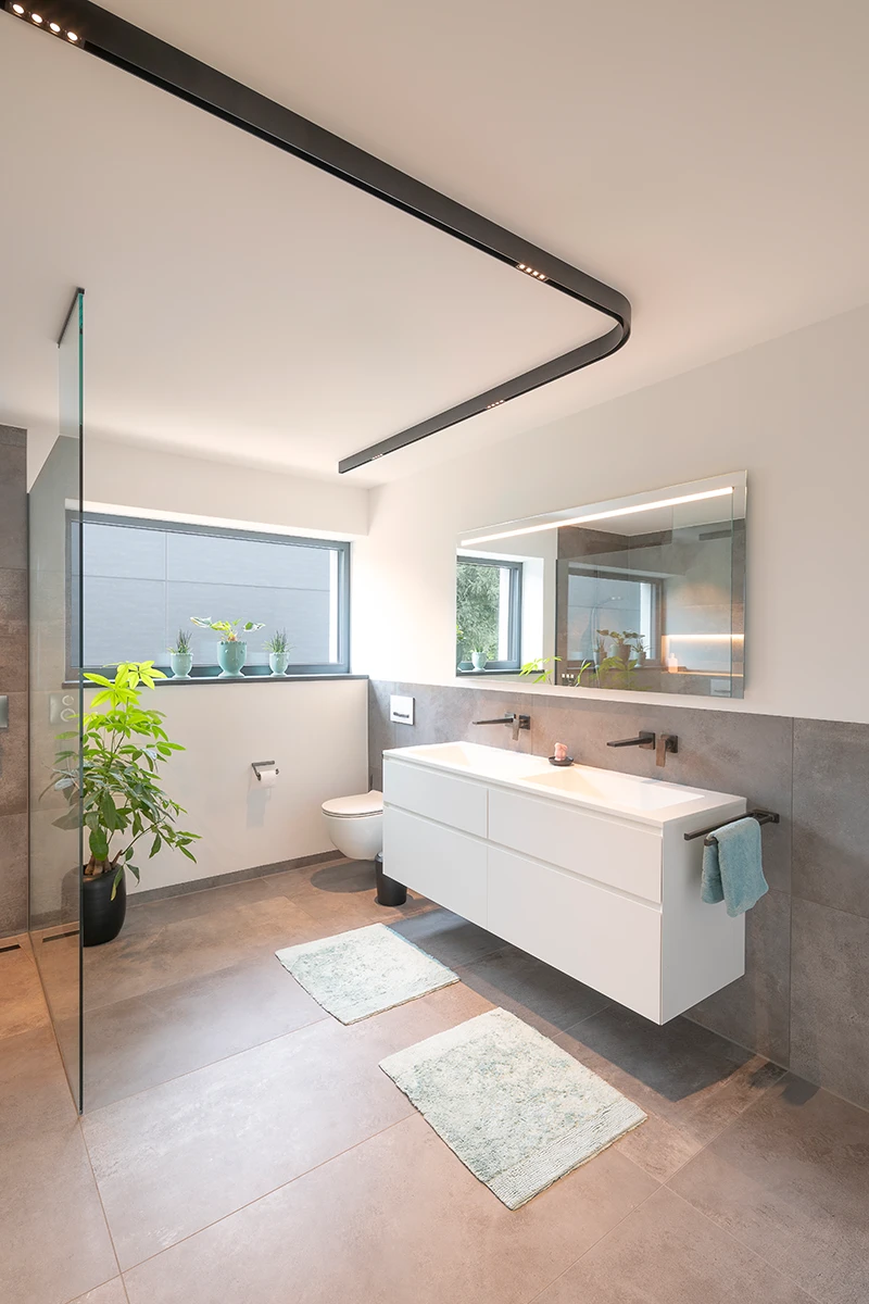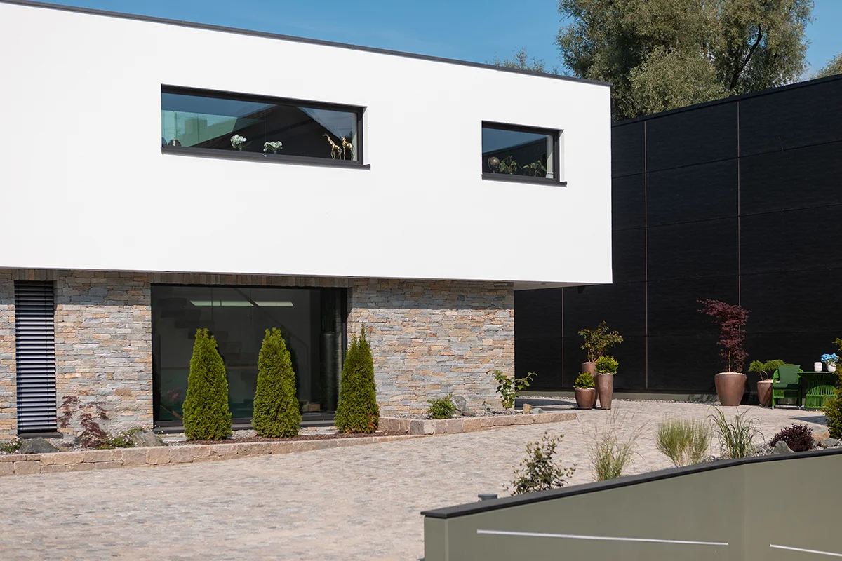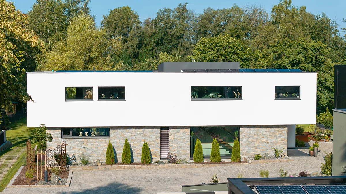 Massive Bauqualität mit 42 Außenwandsteinen trifft auf smarte Gebäudetechnik: Eine KNX-Steuerung vernetzt Beleuchtung, Heizung, Verschattung und Sicherheit. Beheizt wird das Einfamilienhaus durch die Betonkernaktivierung – effizient und komfortabel. Die eigene Stromversorgung durch eine PV-Anlage steigert die Unabhängigkeit, während ein besonderes Sicherheitssystem für zusätzliche Ruhe sorgt.