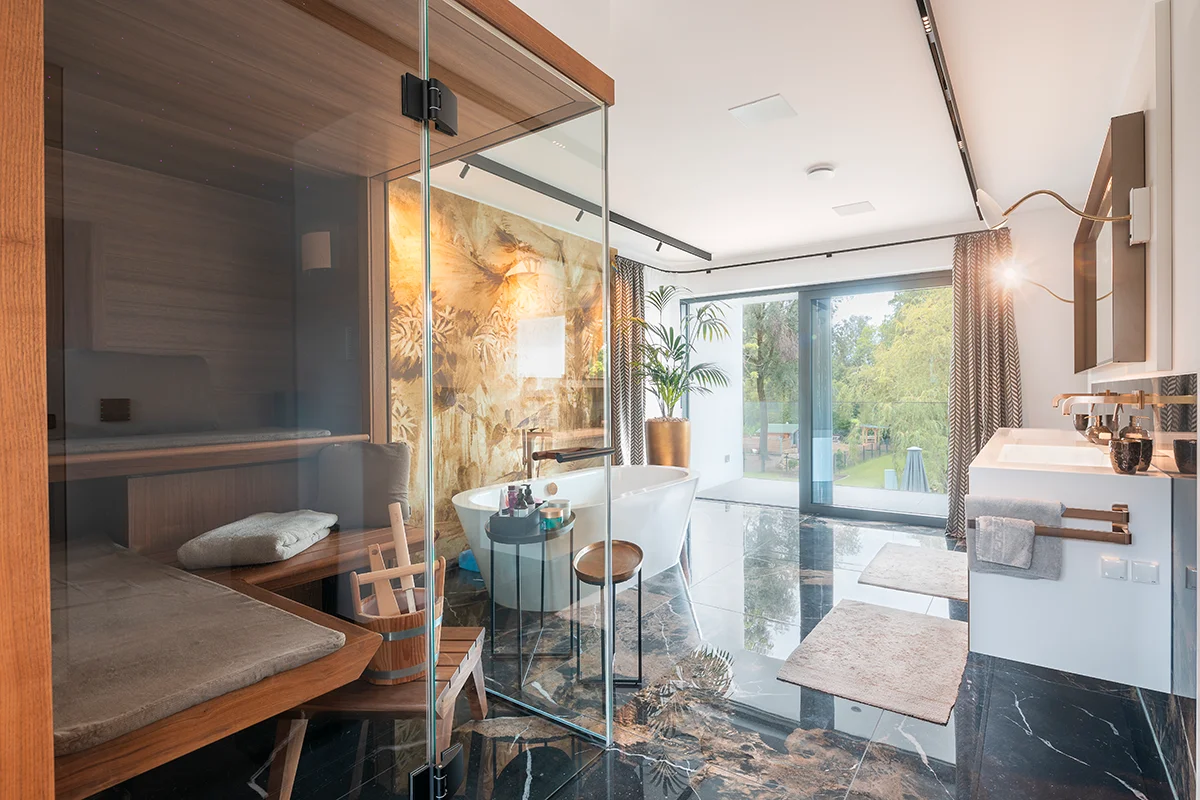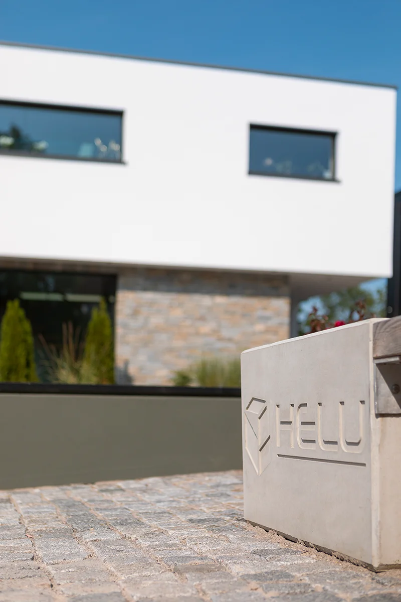 Ein modernes Einfamilienhaus vereint Architektur, Technik und Komfort auf eindrucksvolle Weise: Eine Steinfassade, große Glasflächen und -fenster sowie eine große Lichtkuppel im Flachdach belichten den Wohnbereich großzügig. Ein besonderes Sicherheitssystem und die Tiefgarage erhöhen Alltagssicherheit und Komfort, während der große Garten mit Naturteich den Wohnraum ins Grüne verlängert. Innen sorgen ein großes Bad mit Sauna und eine Staubsaugeranlage für zusätzlichen Wohlfühl- und Bedienkomfort.
